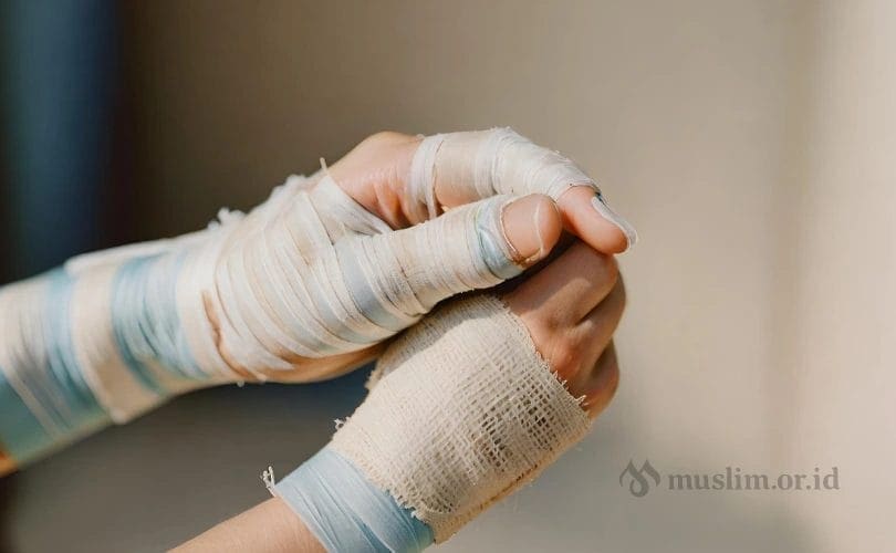 Ada kalanya seseorang mendapatkan musibah berupa luka di tangannya. Dalam rangka pengobatan, dokter mengharuskan pemakaian perban di tangan tersebut. Ketika dia hendak berwudu untuk salat, apakah dia harus melepas perbannya karena di antara syarat sah wudu adalah tidak adanya penghalang sampainya air ke kulit, atau dia boleh mengusapnya sebagaimana diperbolehkannya mengusap khuf?