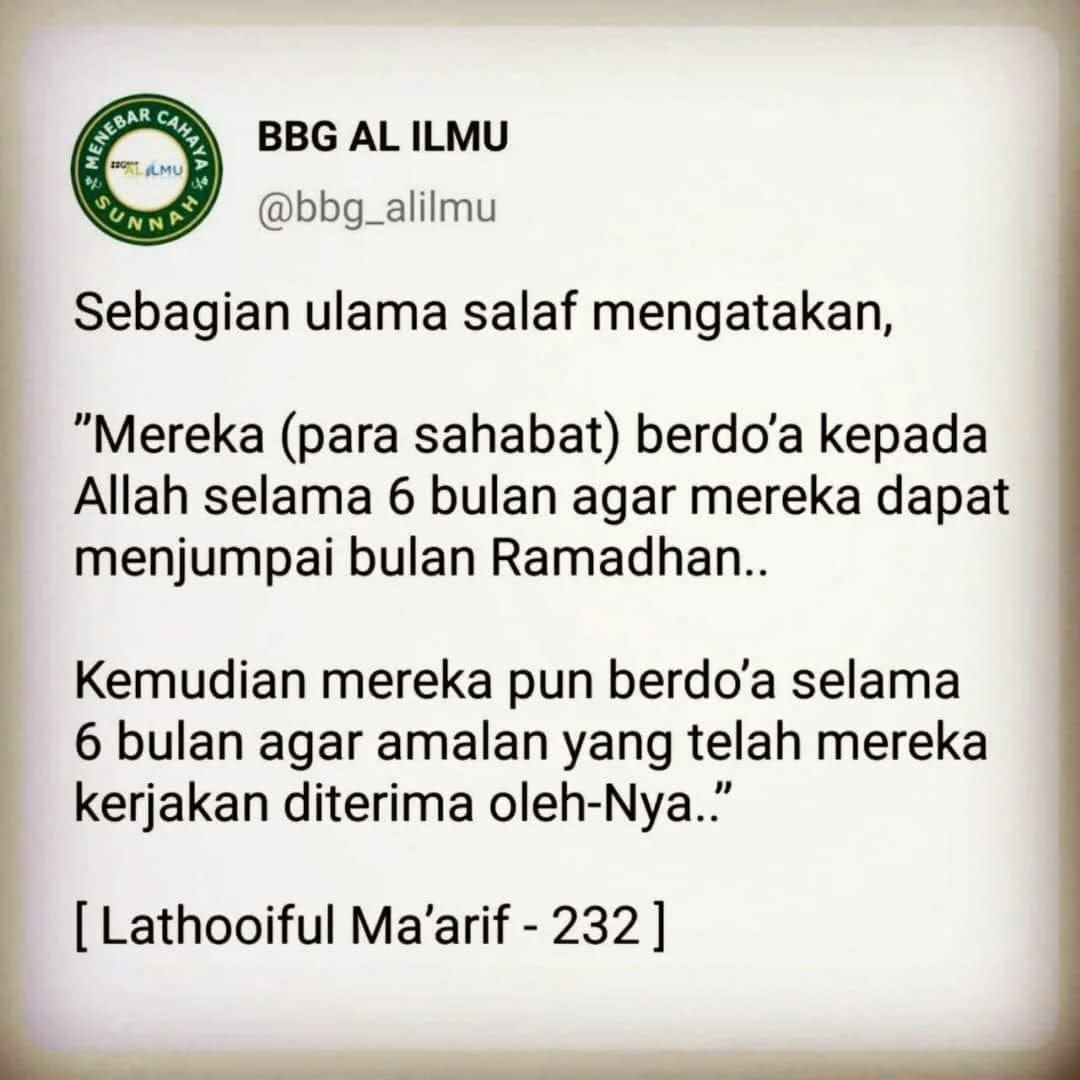 para sahabat rodhiyallahu ‘anhum berdo’a selama 6 bulan sebelum Ramadhan agar Allah mempertemukan kembali mereka dengan bulan Ramadhan ..